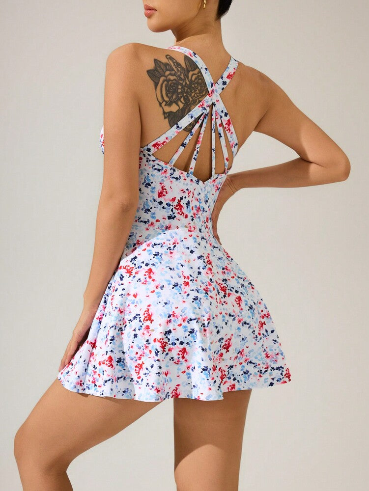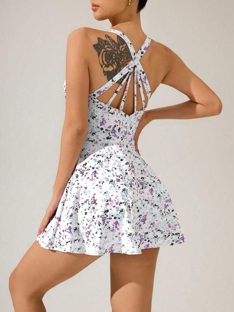 This slim-fit women's mini sports dress combines style and functionality for active lifestyles. Crafted from 90% polyester and 10% elastane, its high-stretch fabric ensures freedom of movement during yoga, tennis, or studio workouts. Featuring a scoop neckline, criss-cross design, and backless detail, it offers breathability and a flattering silhouette. The all-over plant pattern adds a fresh, casual vibe, while the sleeveless cut enhances comfort. Easy to care for with machine wash or professional dry clean, this dress is an expert choice for summer fitness and athletic activities.