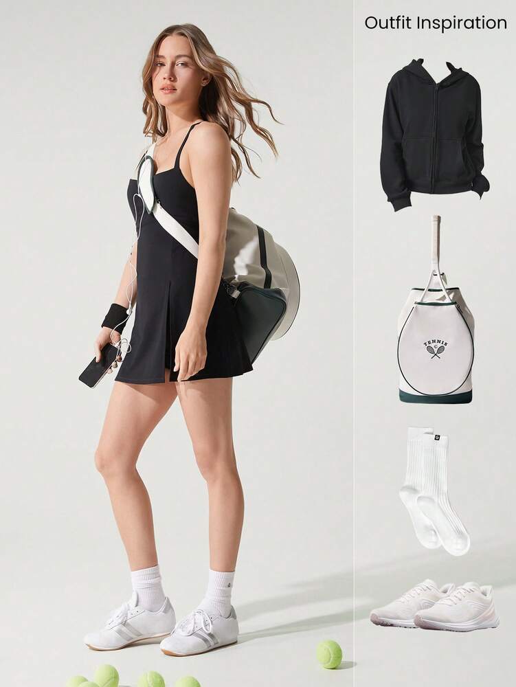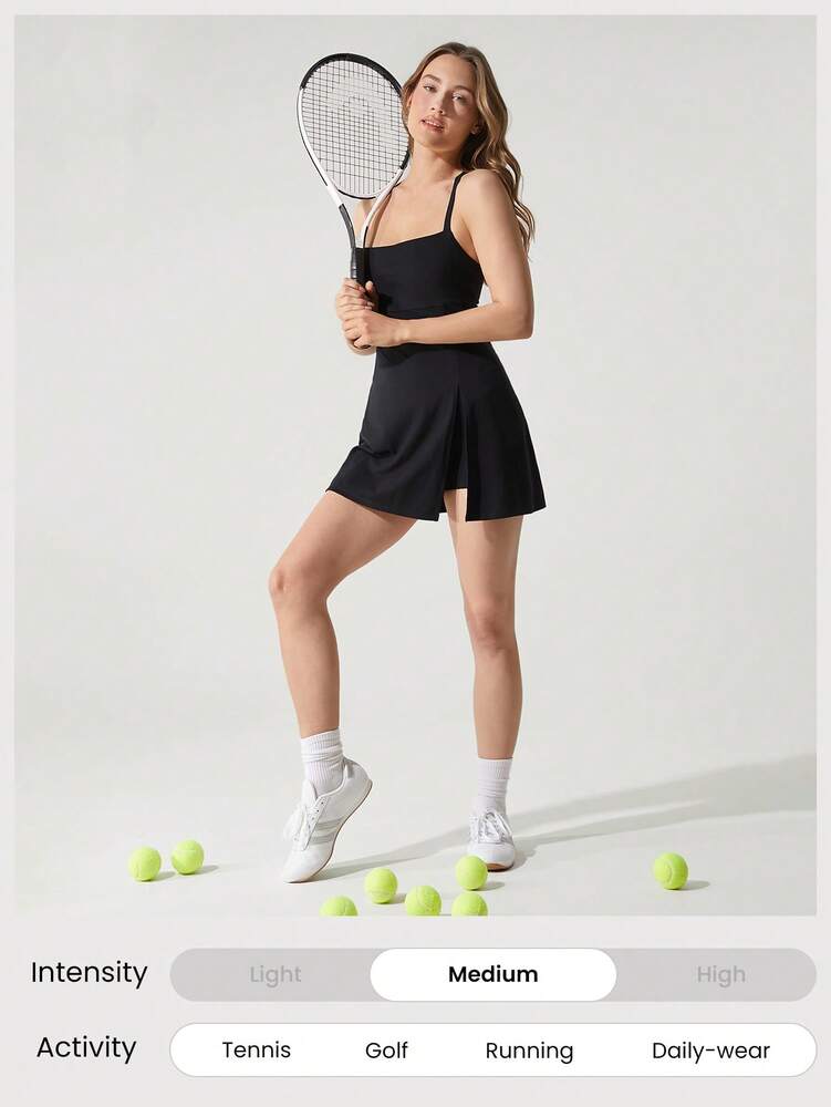 This black, knitted active dress features a spaghetti strap neckline and a stylish criss-cross, backless V back design. Crafted from 78% polyamide and 22% elastane, it offers medium stretch for comfortable movement during daily activities or sports like tennis, golf, and pickleball. The mini-length dress includes built-in shorts and side pockets for practical convenience, while the front slit enhances mobility. Its regular fit ensures ease of wear, and the sleeveless cut keeps you cool. Machine washable and made with a breathable fabric blend, it balances performance with casual style.
