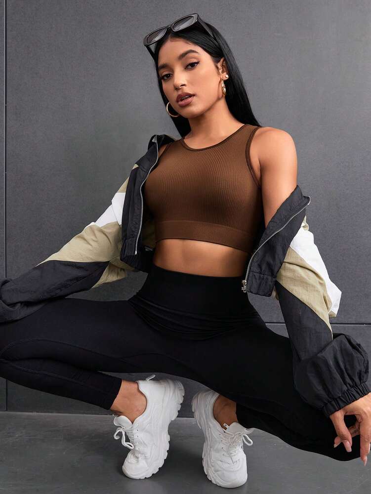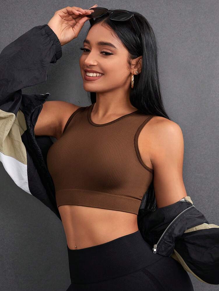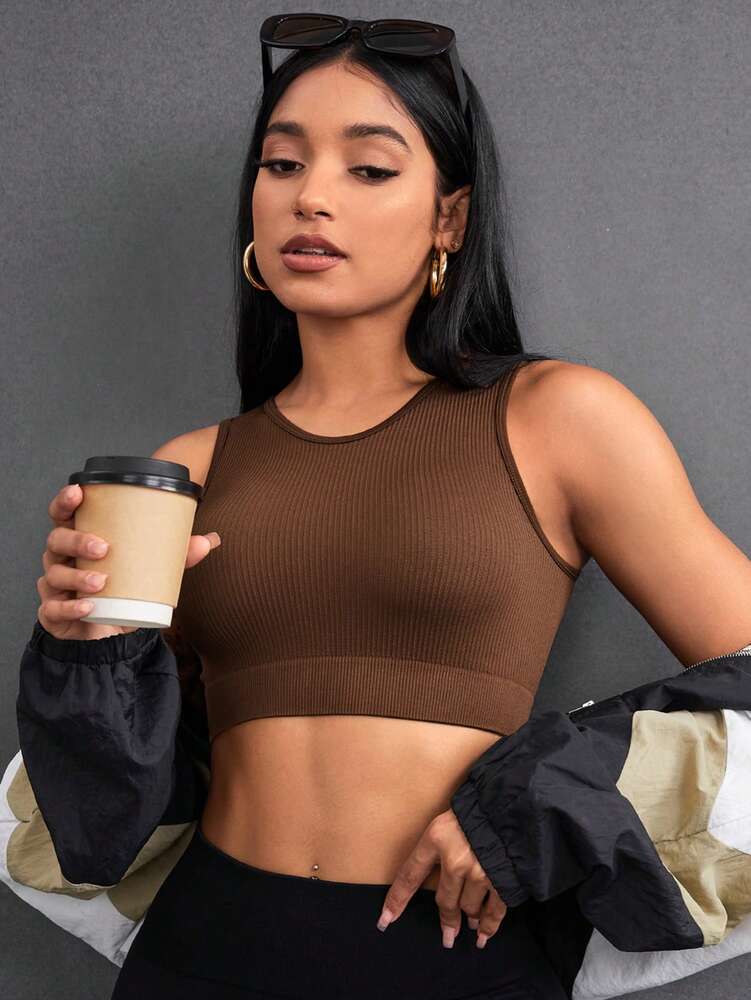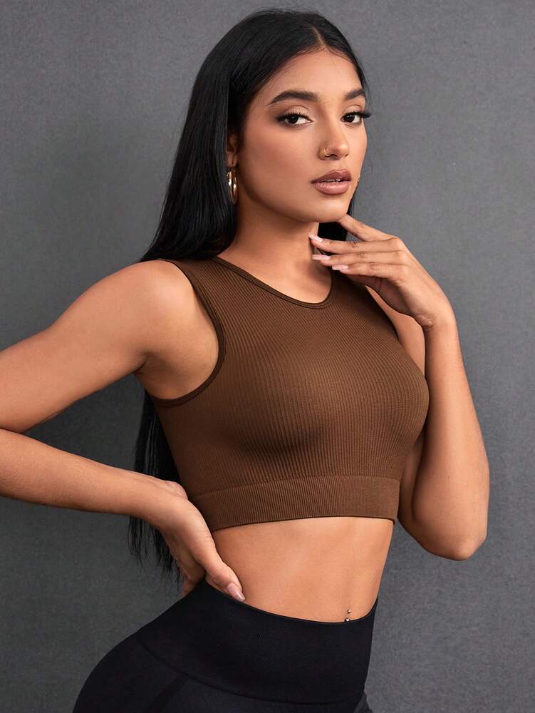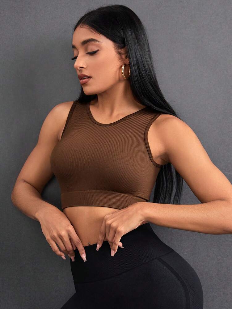 This women's rib-knit sports tank top offers a sleek, slim fit with high-stretch fabric composed of 90% polyamide and 10% elastane for optimal flexibility during intense workouts. Its seamless, backless racerback design enhances breathability and freedom of movement, while the cropped length and sleeveless style make it ideal for yoga and studio activities. Easy to care for with machine wash instructions, this brown tank top combines functionality and comfort for a focused, performance-driven workout experience.