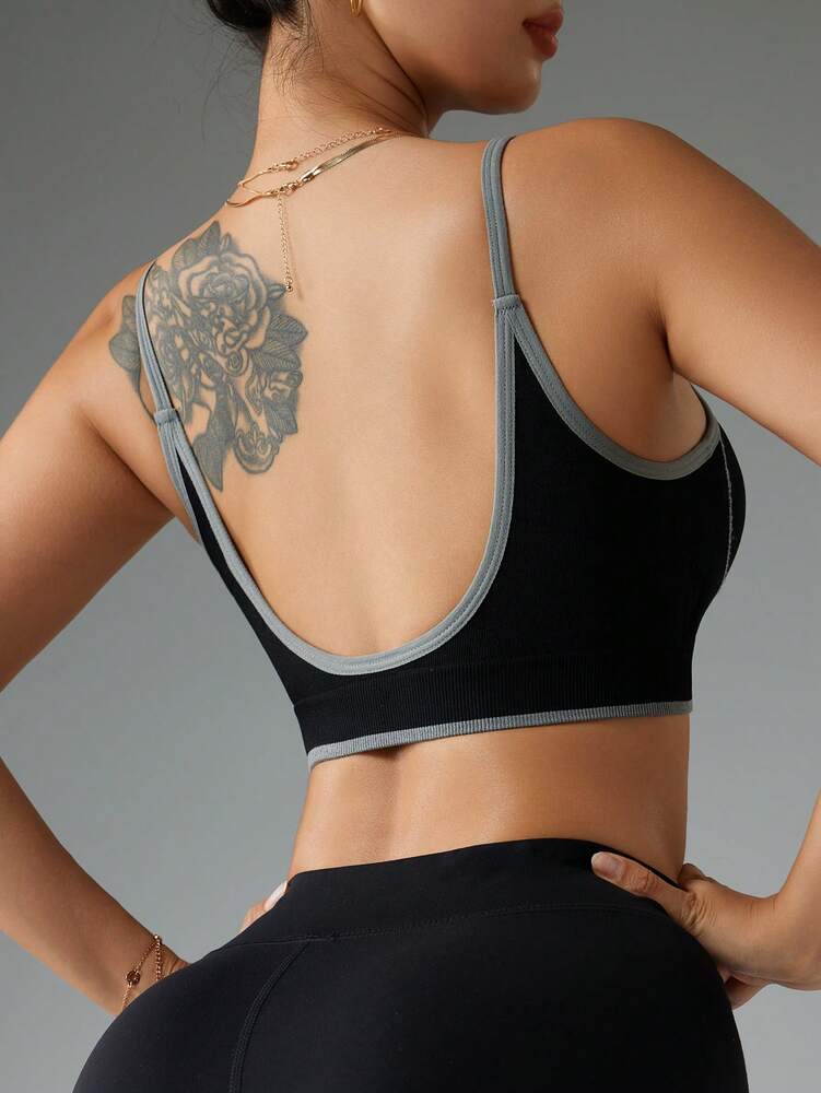 This women's seamless sports bra offers medium support with a high-stretch fabric blend of 88% polyamide and 12% elastane, ensuring comfort and flexibility during yoga and studio workouts. Featuring a trendy colorblock and letter print, it has a backless design with straight and crossed spaghetti straps for a secure fit. The micro crop length and removable chest padding provide customizable comfort, while the wireless construction maintains natural movement. Designed for easy care with hand washing recommended, this bra combines function and style for an effective, comfortable activewear experience.