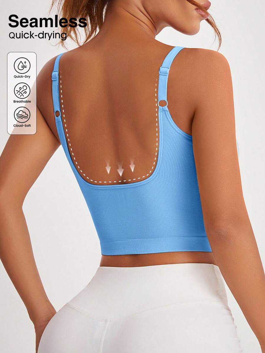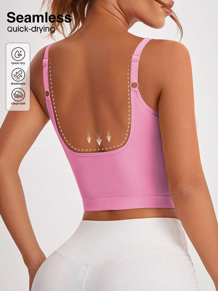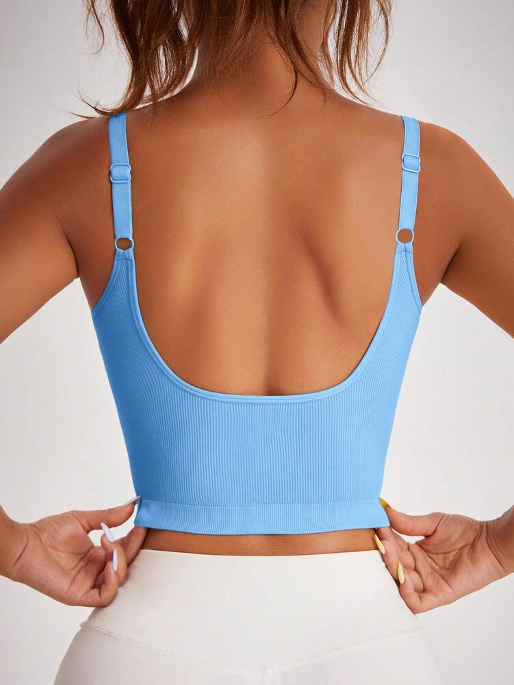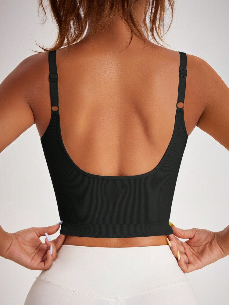 This black, slim-fit crop top features a seamless, rib-knit fabric blend (90% polyamide, 10% elastane) with high stretch for optimal comfort during yoga or studio workouts. Designed with a backless, spaghetti strap neckline and sleeveless cut, it offers breathability and freedom of movement. The unlined, plain pattern design provides a sleek look without padding or pockets. Easy to care for, simply machine wash and avoid dry cleaning to maintain its quality. Ideal for activewear that combines style and performance.