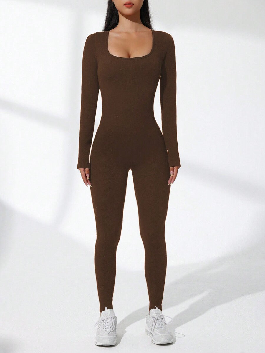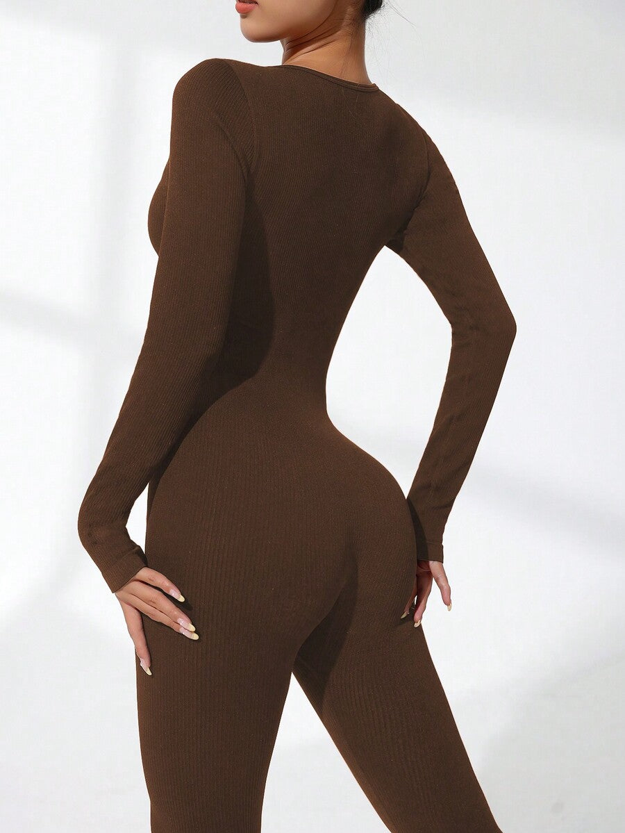 Women's Solid Color Ribbed Long Sleeve Jumpsuit Slim Fit Activewear Yoga Bodysuit Workout Gym Romper Stretch Sports Outfit