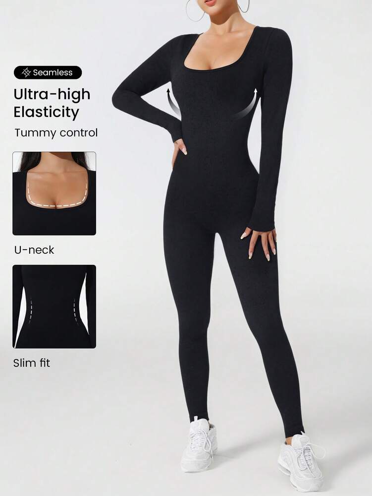 This women's jumpsuit features a square neckline and long, regular sleeves for comfortable coverage. Designed with a natural mid-waistline and a skinny fit, it contours the body for a sleek silhouette. The seamless, backless design offers breathability and style, while the high-stretch fabric blend of 90% polyamide and 10% elastane ensures flexibility during yoga or studio workouts. Its striped pattern and full back detail add subtle texture. Easy to care for with machine wash or professional dry cleaning, this black activewear piece combines functionality with modern design.